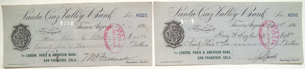Two checks drawn on Santa Cruz Valley Bank. Both stamped paid by London, Paris & American Bank, San Francisco.
