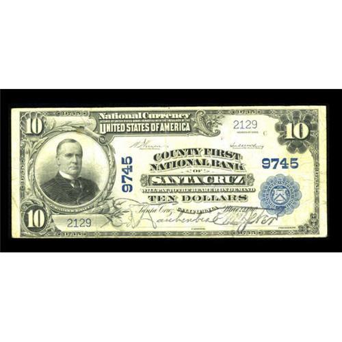 <B>Santa Cruz, CA</B></I> - $10 1902 Plain Back Fr. 627 <B>County First NB</B></I> Ch. # 9745<BR> This note bears the second and by far the scarcer title used here on large size notes. Just eight examples are known bearing this nomenclature, with this piece likely as nice as any. Pleasing <B>Fine, </B></I>with strong signatures. <BR><I>From The Kansas City Collection.</B></I><BR><BR><b>Shipping:</b> Coins & Currency (<a target="_blank" href="http://www.heritageauctions.com/common/shipping.php">view shipping information</a>)