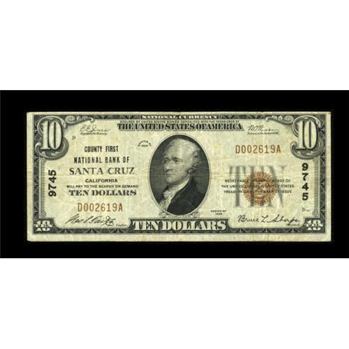 <B>Santa Cruz, CA</B></I> - $10 1929 Ty. 1 <B>County First NB</B></I> Ch. # 9745<BR> Fortunately for Santa Cruz County collectors the Kansas City collection contained two notes from this highly sought after bank. Nice <B>Fine-Very Fine.</B></I><BR><I>From The Kansas City Collection.</B></I><BR><BR><b>Shipping:</b> Coins & Currency (<a target="_blank" href="http://www.heritageauctions.com/common/shipping.php">view shipping information</a>)