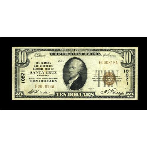 <B>Santa Cruz, CA</B></I> - $10 1929 Ty. 1 <B>The Farmers & Merchants NB</B></I> Ch. # 10571<BR>Small notes only from this Santa Cruz issuer. <B>Very Fine.</B></I><BR><BR><b>Shipping:</b> Coin/Currency (<a target="_blank" href="http://www.heritageauctions.com/common/shipping.php">view shipping information</a>)