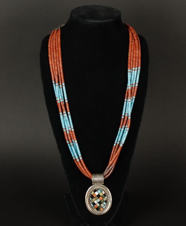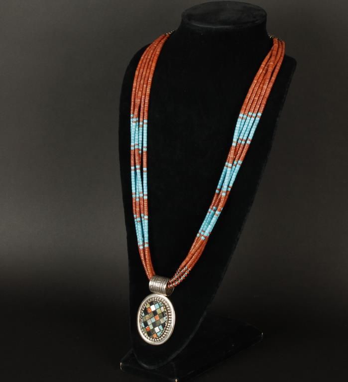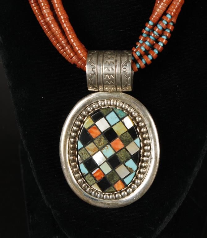 necklace with pendant with inlaid turquoise, onyx, gaspeite, mother of pearl and other stones in a checkerboard pattern, set in sterling silver, by noted artist Tony Aguilar sign "T.A".