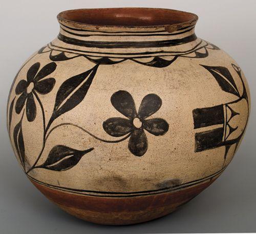 Santa Domingo Olla. Bird Designs. 14 ½” x 17". Shows use. Fabulous pot. (est $10,000-12,000).