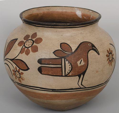 Santa Domingo Olla. Parrot Design. 9" x 10 ½”. Fine condition. One very small 1/8” rim chip. (est $3,000-4,000).