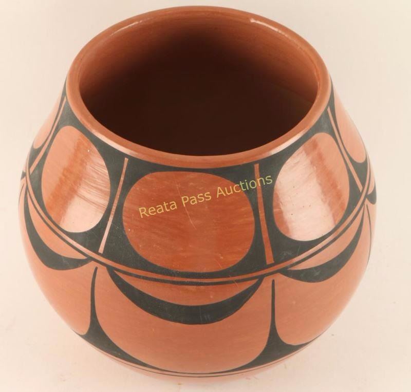 Redware Olla with and circular geometric black design, unsigned, 8"TX6"W.
