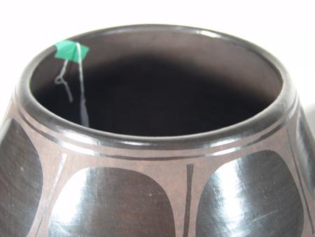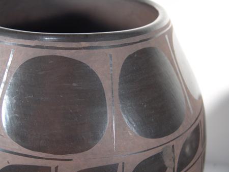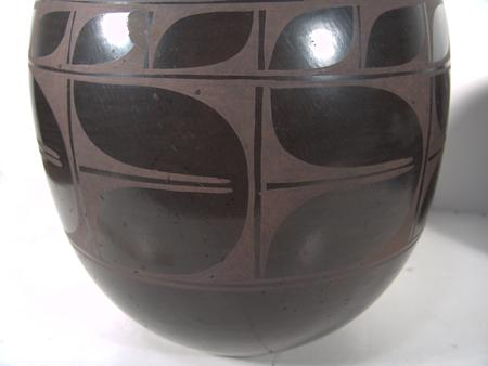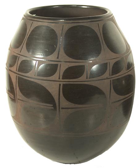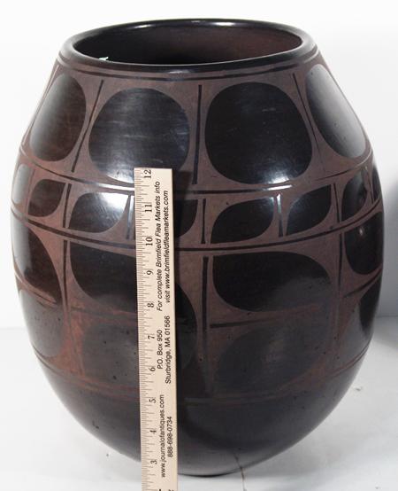 Huge and sturdy black-on-black wide-mouthed jar with traditional Santa Domingo designs. Condition: very good. 15" x 13"