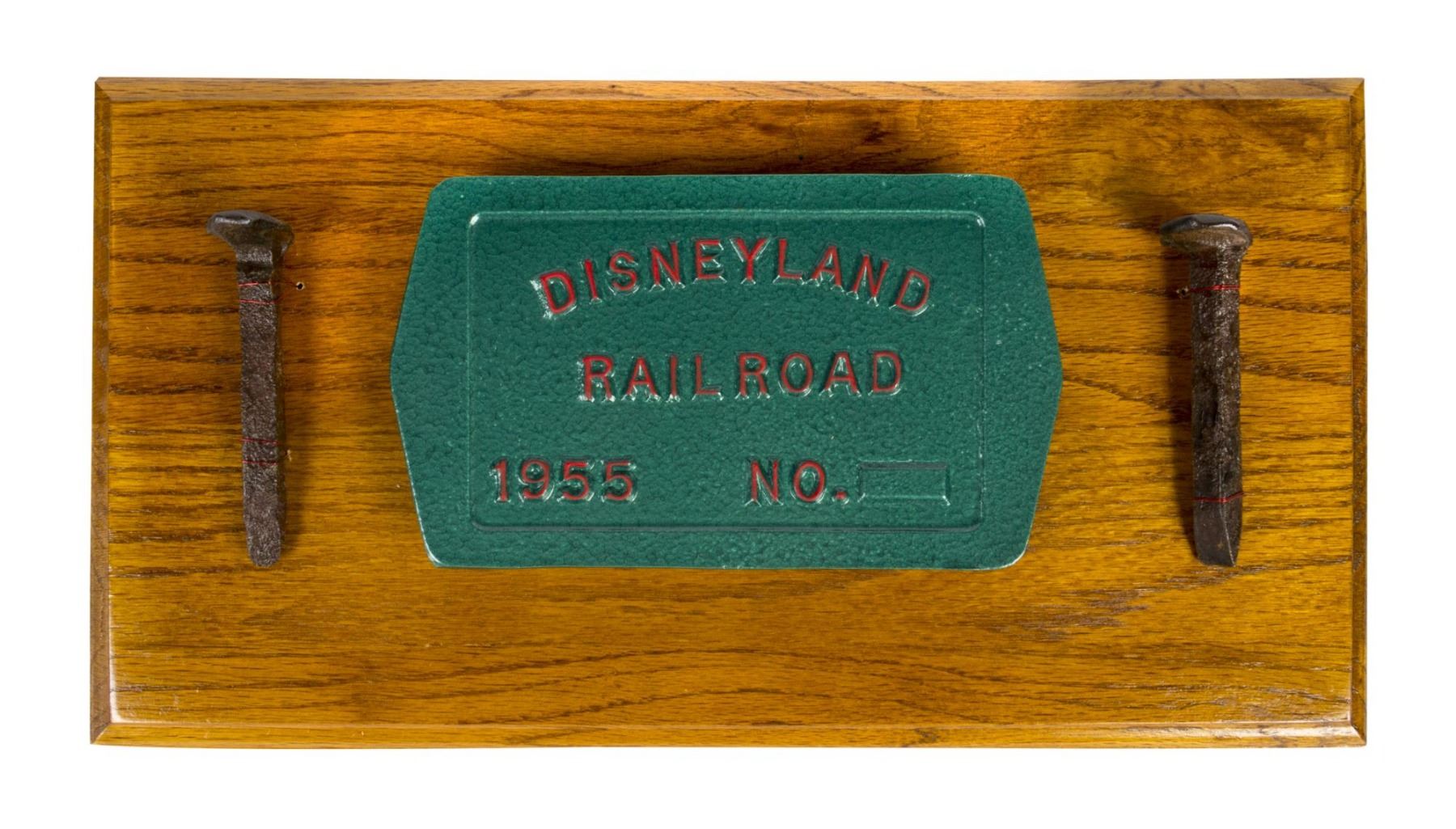 (Disneyland, 1955) A pair of original railroad spikes from the "Santa Fe & Disneyland Railroad" that are displayed on a wooden plaque with a reproduction metal boiler plate. Measuring approximately 10"x19", the display is in very good condition with expected wear to the spikes from use.