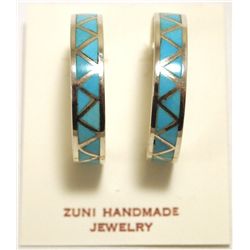 Zuni Turquoise Inlay Sterling Silver 3/4 Ring Post Earrings - Joann Peina