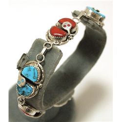 Zuni Coral & Turquoise Sterling Silver Snake Wide Link Bracelet - Effie Calavaza