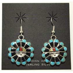 Zuni Multi-Stone Inlay Sun Face Sterling Silver French Hook Earrings - Verdel & Esther Niiha Measure 1-3/4" tall by 7/8" wide. Stone...