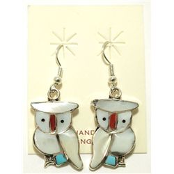Zuni Multi-Stone Inlay White Owl Sterling Silver French Hook Earrings - Pitkin Natewa Measure 1-5/8" tall by 5/8" wide. Stones present: ...