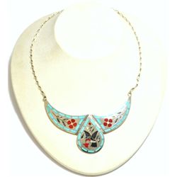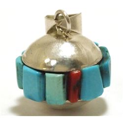 Navajo Coral & Turquoise Inlay Sterling Silver Pendant - Edison Yazzie