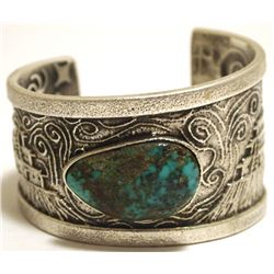 Navajo Mountain Turquoise Sterling Silver Tufacast Pueblo Cuff Bracelet - Philander B Begay