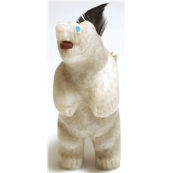 Zuni Marble, Coral & Turquoise Bear Fetish - Ben Livingston Measures 3-1/8" tall by 1-3/8" wide by 1-3/4" deep. Has a turquoise...
