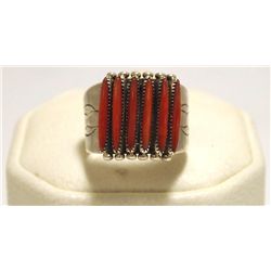 Zuni Coral Petit Point Sterling Silver Men's Ring - Shirley Quam528 - Zuni Coral Petit Point Sterling Silver Men's Ring - Shirley Quam