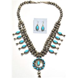 Navajo Turquoise Sterling Silver Squash Blossom Necklace & Earrings Set - L.F.K.541 - Navajo Turquoise Sterling Silver Squash Blossom Necklace & Earrings Set - L.F.K.