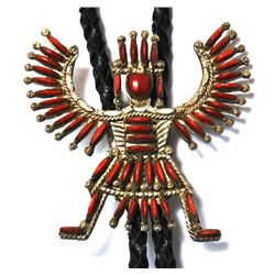 Zuni Coral Sterling Silver Knifewing Kachina Bolo Tie - Hugh & Agnes Bowekaty Measures 2-1/2" tall by 2-1/2" wide, 38" around. ...