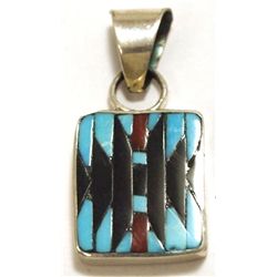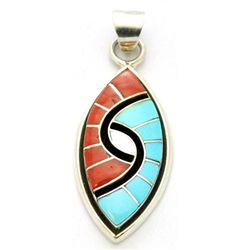 Zuni Onyx Coral & Turquoise Inlay Sterling Silver Pendant - Charlotte Dishta1609 - Zuni Onyx Coral & Turquoise Inlay Sterling Silver Pendant - Charlotte Dishta