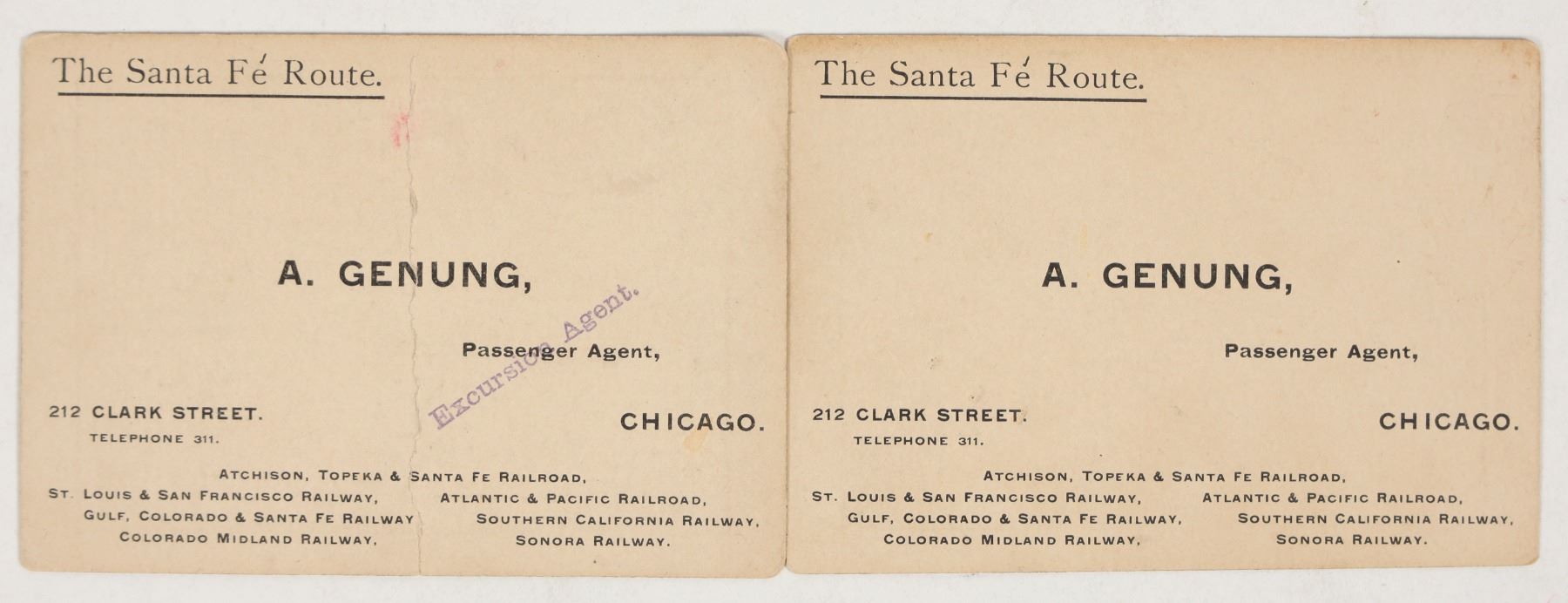 Santa Fe RR Business Card W/Map. Title A. Genung, Passenger Agent. The map on the back is c1858.