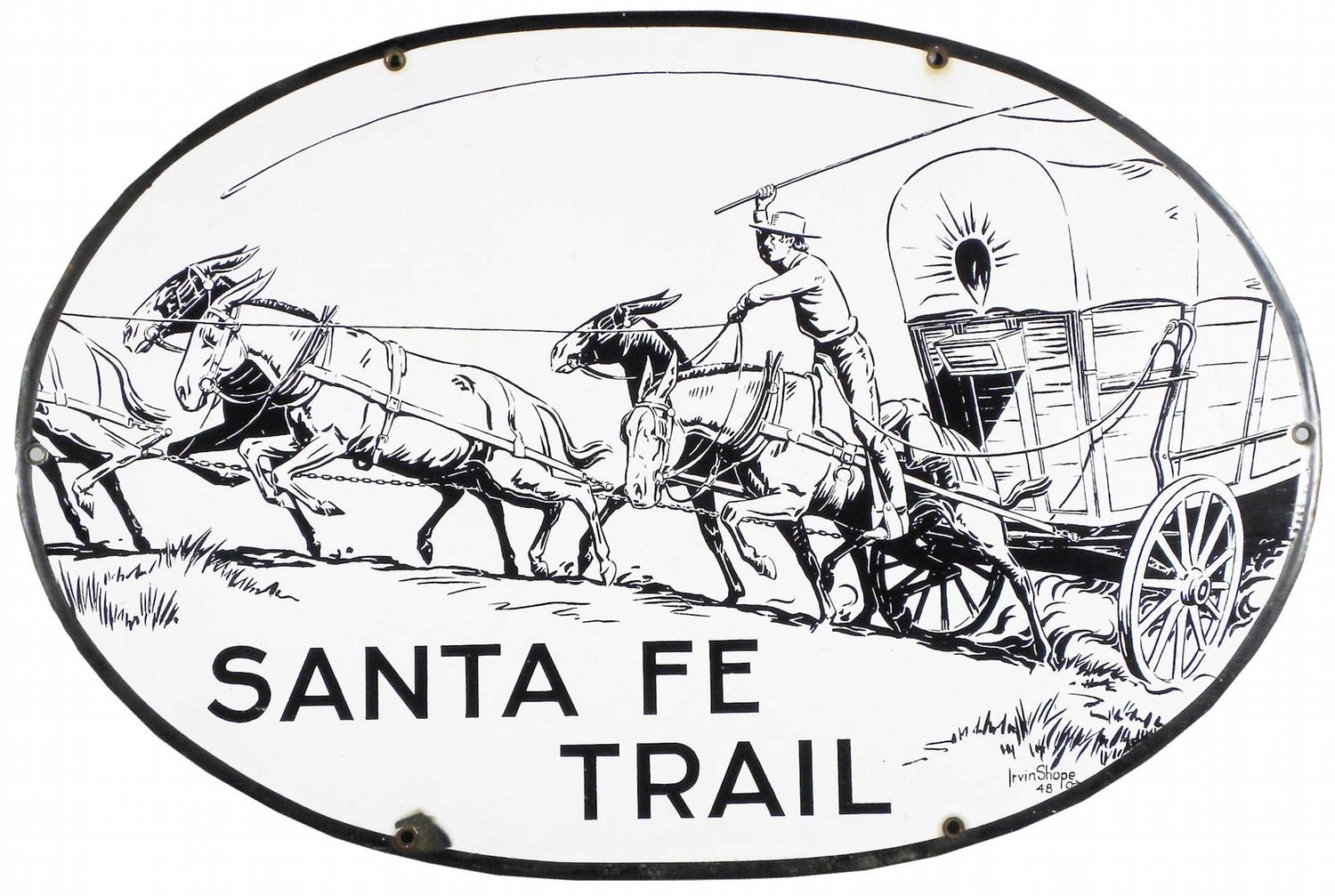 Santa Fe Trail Porcelain Sign. Small chip at grommet otherwise excellent condition. Approx. 22 X 14 inches.