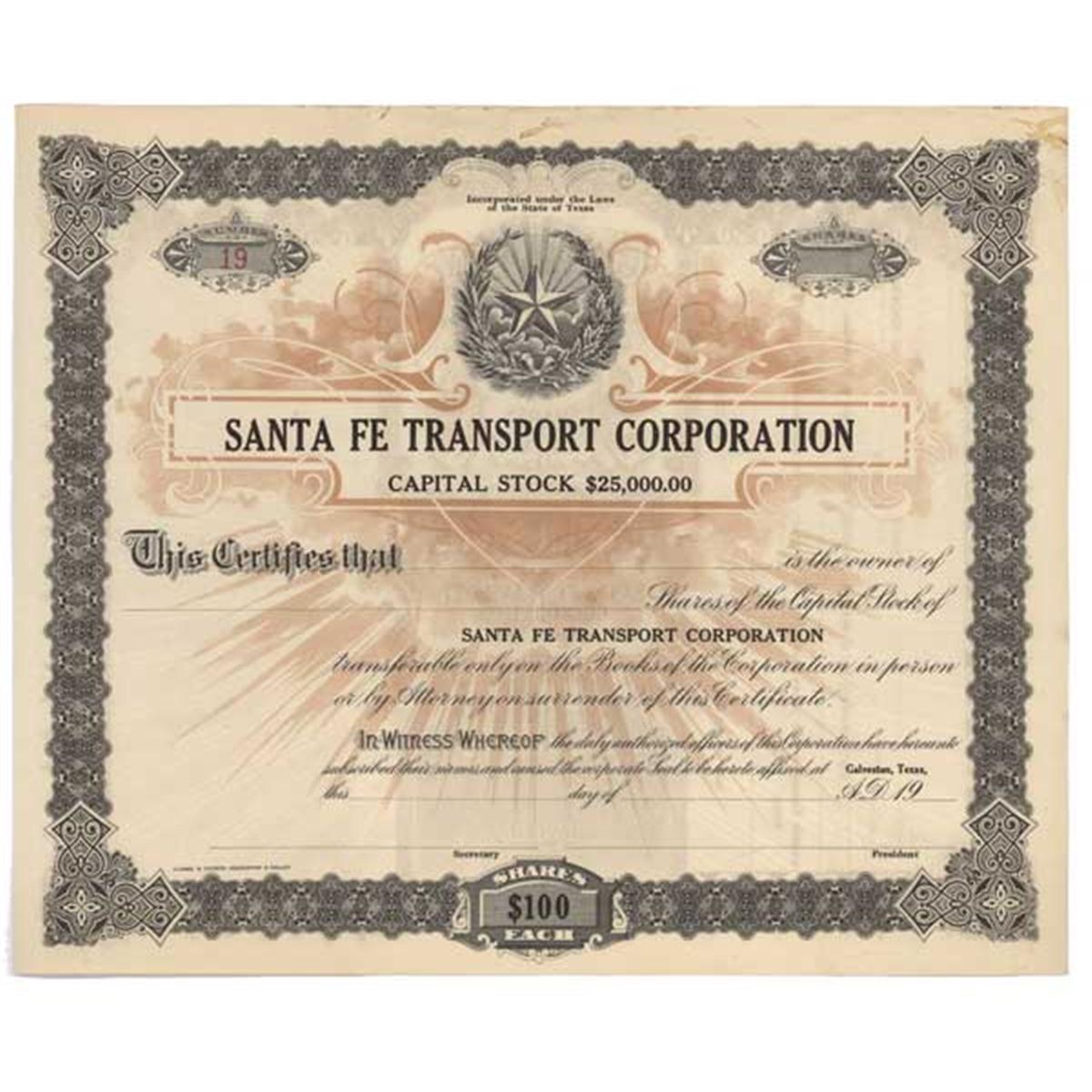 19--, Texas. Unissued stock certificate. Black / White. Vignette of a star and laurels at top center. Brown underprint. Ornate border.