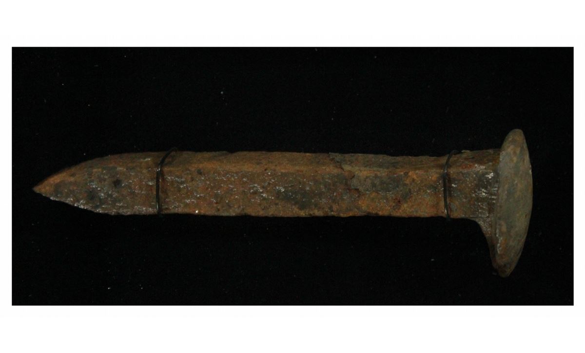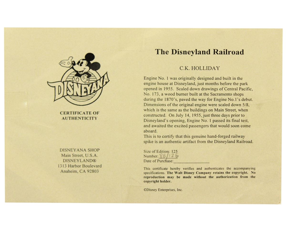 (Disneyland, 1955) Original train spike from the Santa Fe and Disneyland Railroad attractions framed and sold as a limited edition through the Disneyana shop. The spike measures 5 in. long. Overall framed size 14 x 11.5 in.