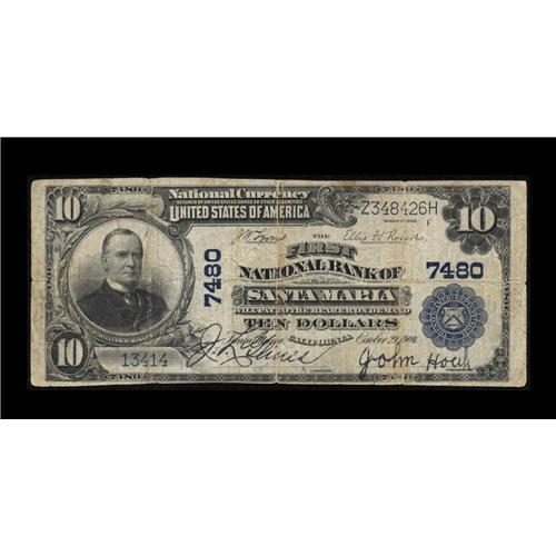 <B>Santa Maria, CA</B></I> - $10 1902 Plain Back Fr. 624 <B>The First NB</B></I> Ch. # 7480<BR>This <B>Fine</B></I> note from the Lowell Horwedel Collection sold for $1,495 at our September, 2004 Long Beach Signature Sale. This bank was the only issuer in this Santa Barbara County locale and it is an extremely elusive locale to acquire, with a published Kelly census on only ten pieces. We expect that it will at least reach the level it sold for in the Horwedel offering and likely even surpass that realization.