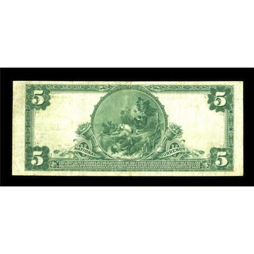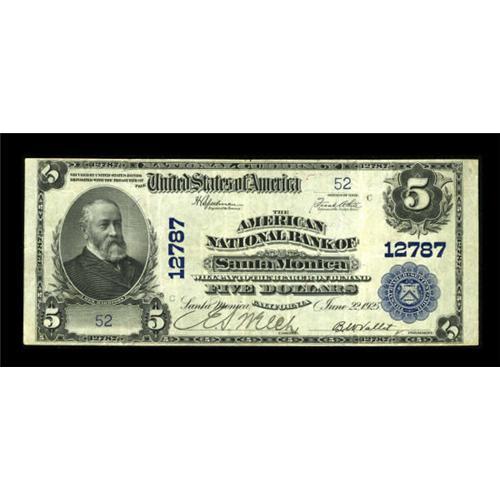 <B>Santa Monica, CA</B></I> - $5 1902 Plain Back Fr. 609 <B>The American NB</B></I> Ch. # 12787<BR> A common enough bank in small size, but definitely not so in large, with the census standing at just seven pieces. This bank had a meager $720 outstanding in large notes in 1935, making it somewhat unlikely that many more examples remain to be discovered. Bright <B>Very Fine</B></I> with sharp pen signatures, a premium example from the "People's Republic."<BR><I>From The Kansas City Collection.</B></I><BR><BR><b>Shipping:</b> Coins & Currency (<a target="_blank" href="http://www.heritageauctions.com/common/shipping.php">view shipping information</a>)