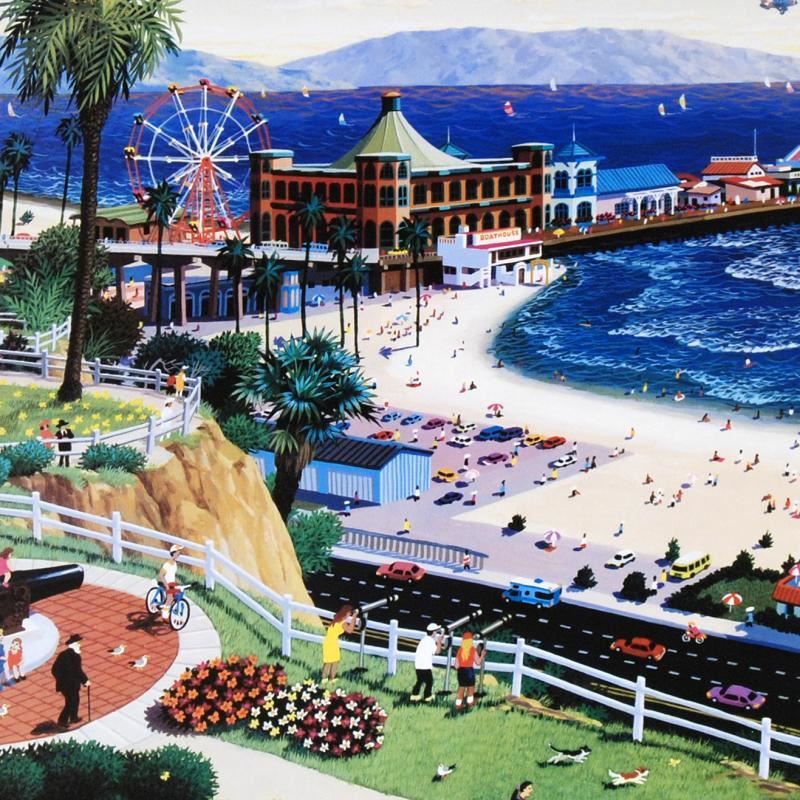 Alexander Chen's depiction of Southern California's famous Santa Monica beach is brought to life through his lively figures and astonishing attention to detail. "Santa Monica" is a limited edition offset lithograph on paper, numbered and hand signed by Chen! Includes Certificate of Authenticity! Measures approx. 23.5" x 17.5" (with border), 21" x 15" (image).