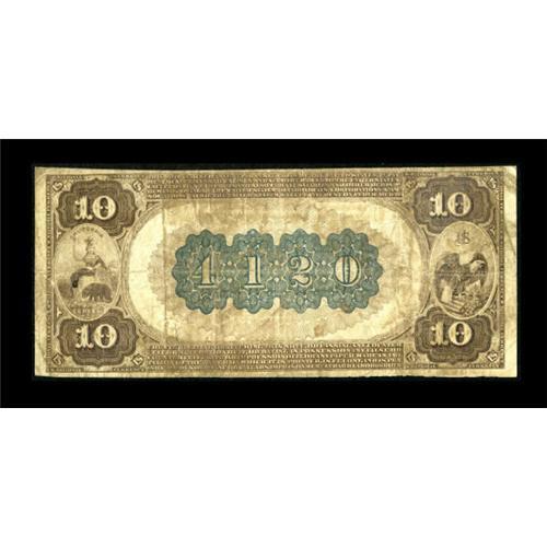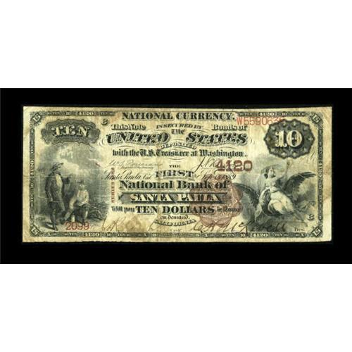 <B>Santa Paula, CA</B></I> - $10 1882 Brown Back Fr. 484 <B>The First NB</B></I> Ch. # 4120<BR> This is one of only two early notes known from this scarce Ventura County bank, and the first Brown Back offered from here in at least two decades. Notes from this community are highly sought after, with even low grade Blue Seals fetching a couple of thousand dollars on the few occasions they have been available. This Brown Back grades <B>Fine,</B></I> but some soiling must be mentioned as well. Expect collector demand to see that bidding climbs into the range of...<BR><I>From The Kansas City Collection.</B></I><BR><BR><b>Shipping:</b> Coins & Currency (<a target="_blank" href="http://www.heritageauctions.com/common/shipping.php">view shipping information</a>)