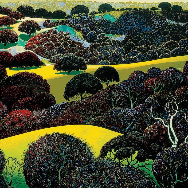 "Santa Ynez Memories" is a limited edition serigraph on paper by Eyvind Earle (1916-2000). The piece is numbered, hand-signed by the artist, and accompanied by a certificate of authenticity. Measures approximately 22" x 28" (image).