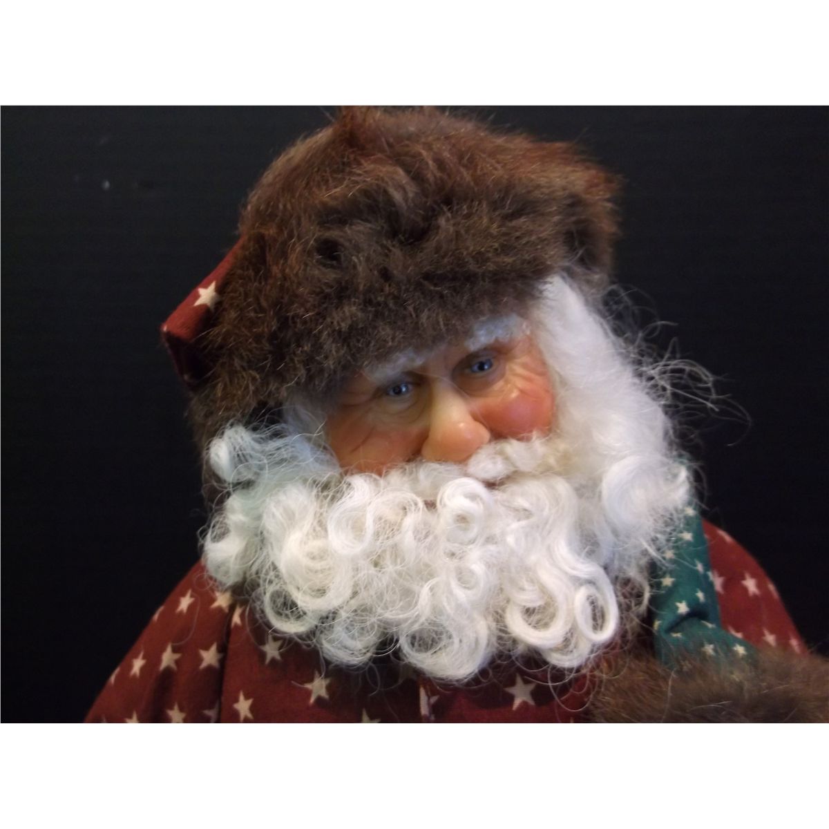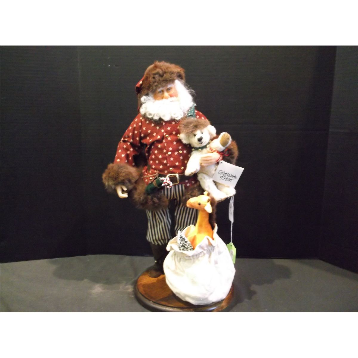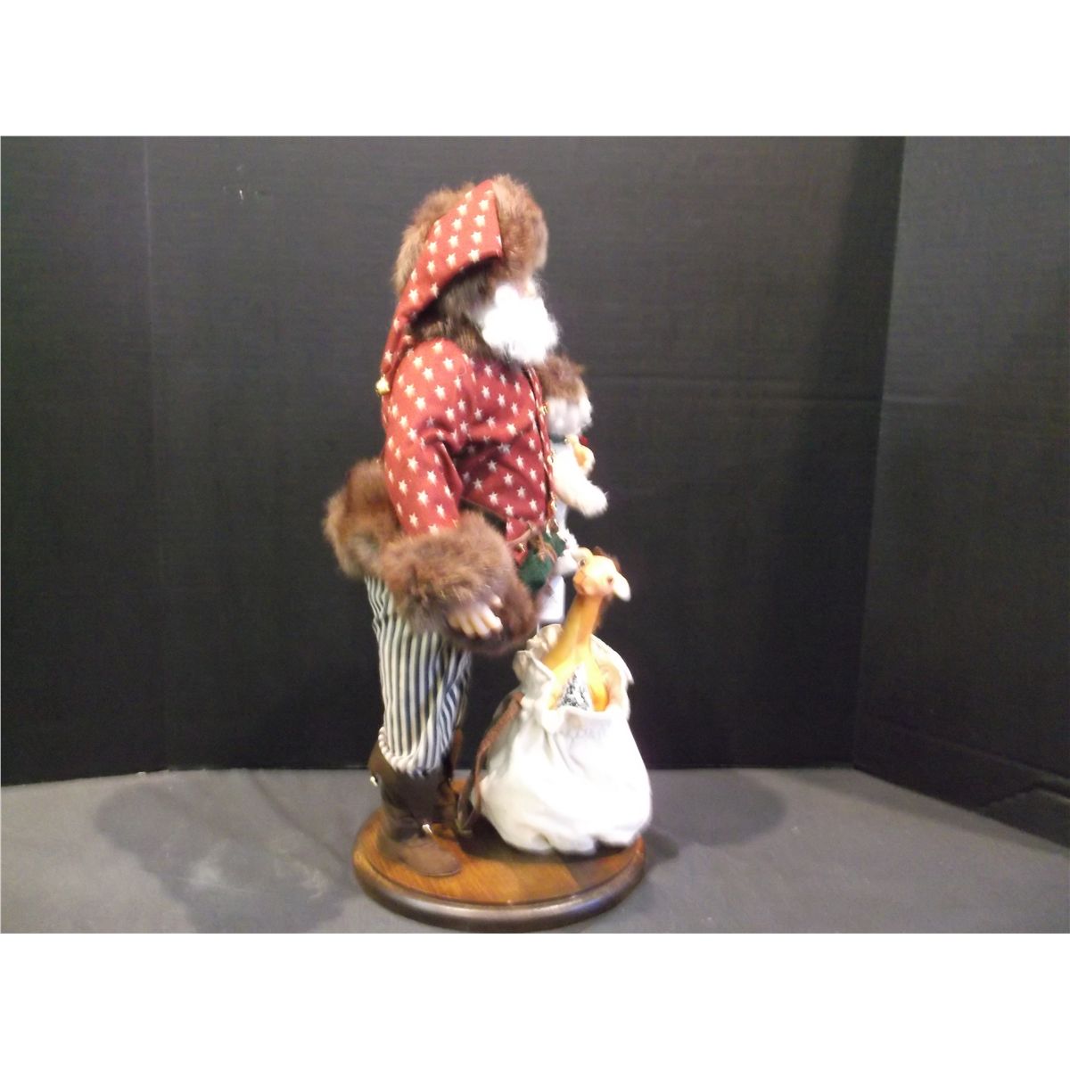Description: Doll, santa, painted face, wearing red star jacket lined with brown fur, carrying 6" jointed bear, on wooden stand, not connected to stand, comes with sack full of individual toys and plush toy giraffe.Work Title: "Santa and Company"Artist Name: Pam HamelDimensions: 18"Medium: Composite face, hands, and feet, soft body.Circa: 1995