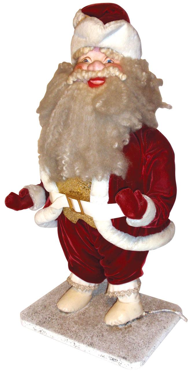 Santa mechanical store display figure, moves at waist, neck & arms, papier-mâché w/red velvet suit &