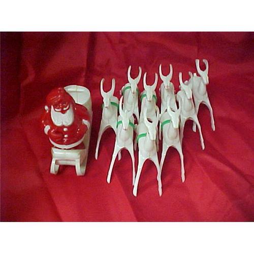 Santa on Sleigh with Reindeer, Rosbro Plastics. Sleigh with Santa approx. 5? x 4.25? and there are 9 deer (approx. 4.5? x 3.5?). This highly collectible set is in fair condition.