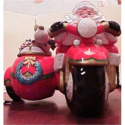 This is a modern day Santa who no longer uses reindeer to deliver presents to good boys and girls. He now speeds around on his motorcycle with the presents in the side car. Made by Fitz and Floyd and signed on the bottom by Robert Floyd in his handwriting. Not all the jars were signed in this manner making this a rare jar. In mint never used condition.A nice companion to the F&F candy jar.