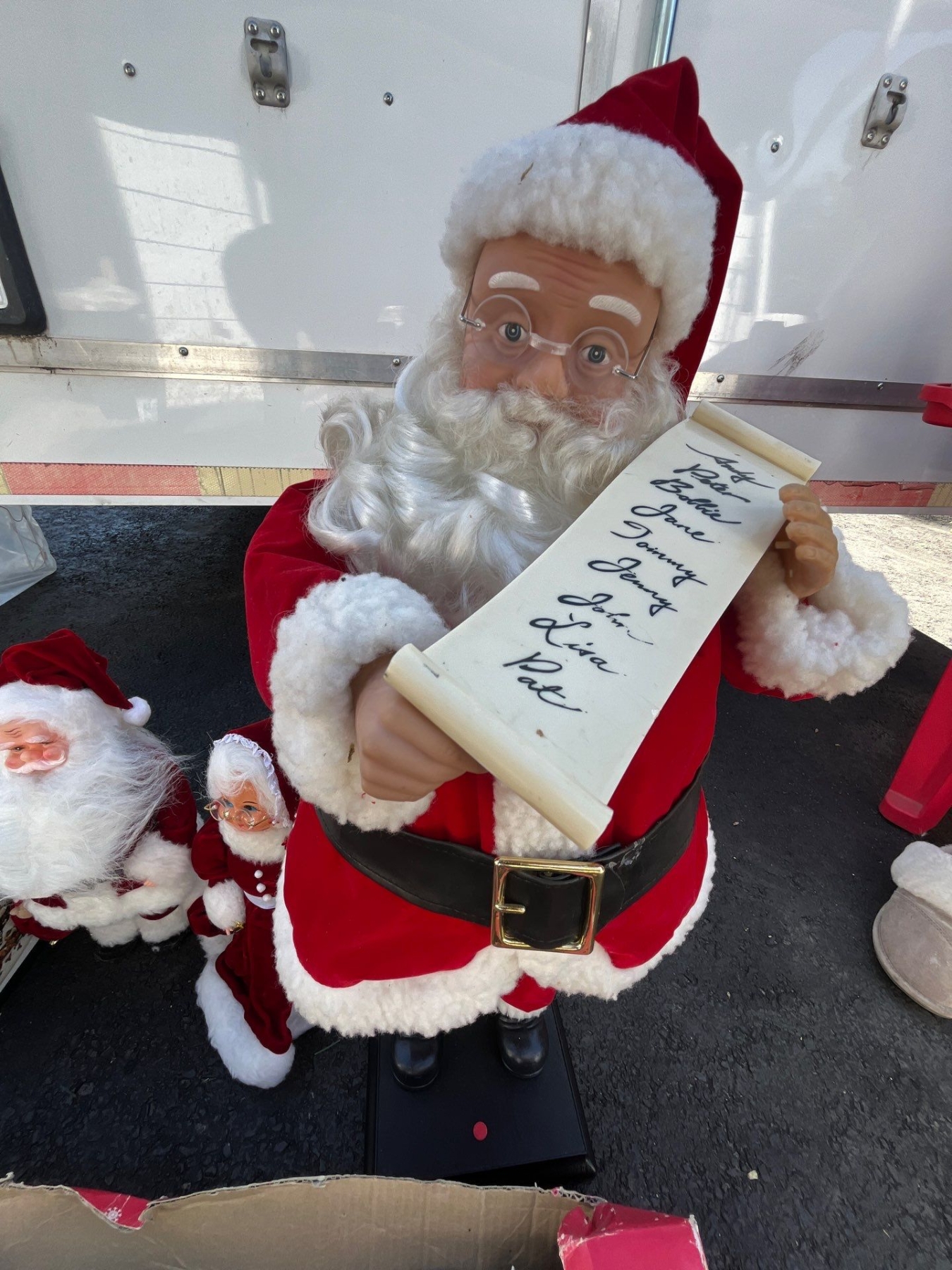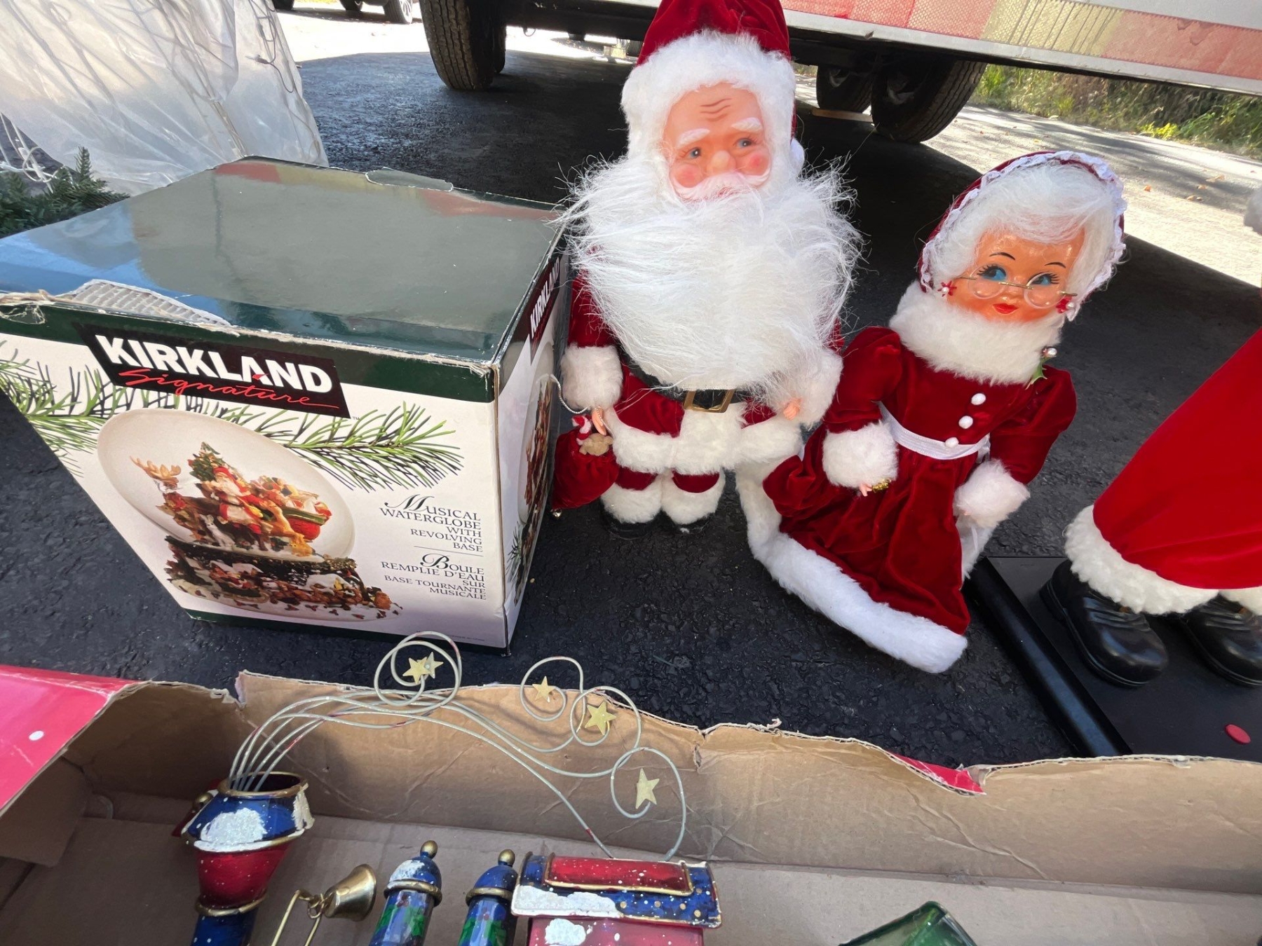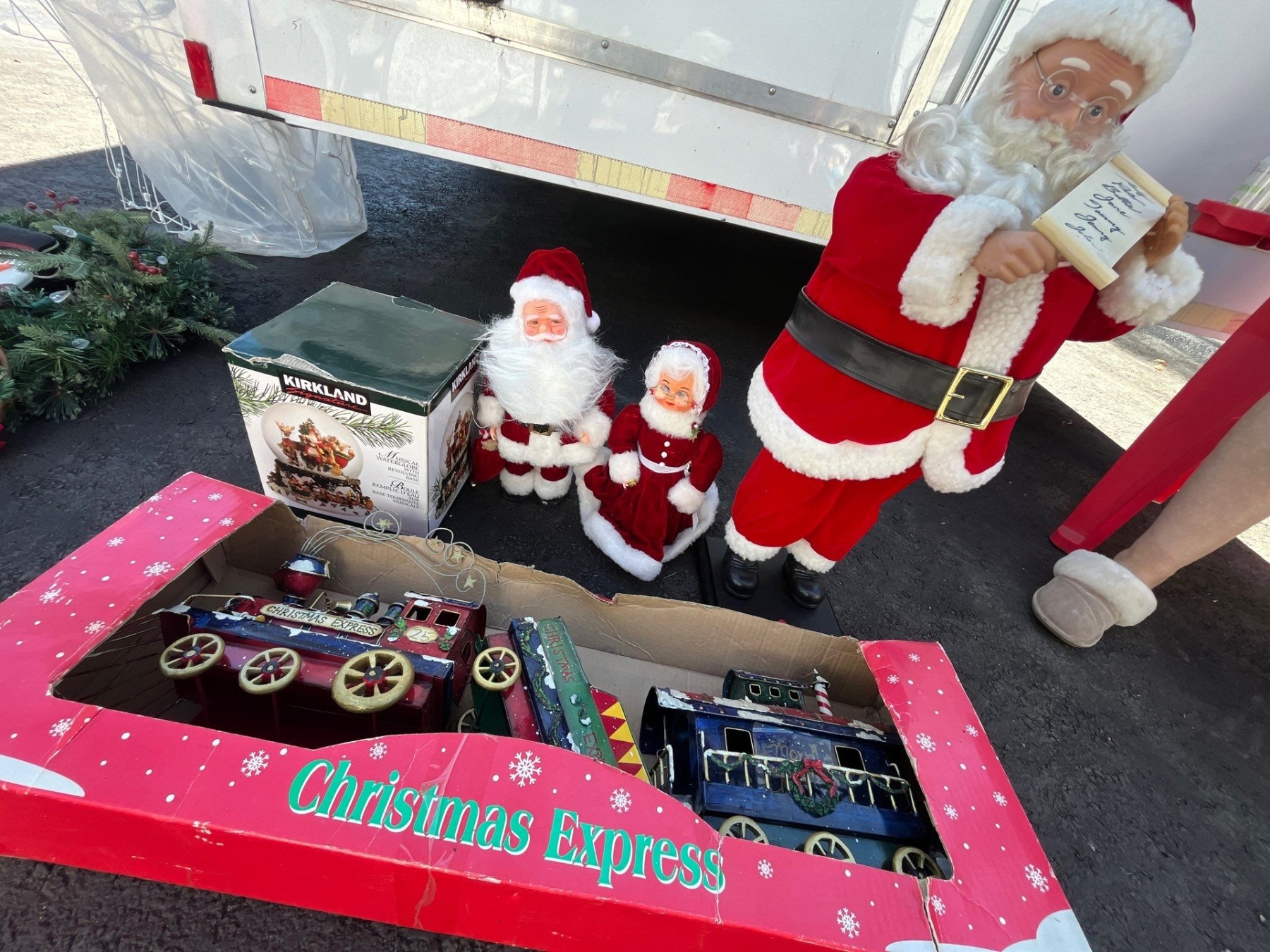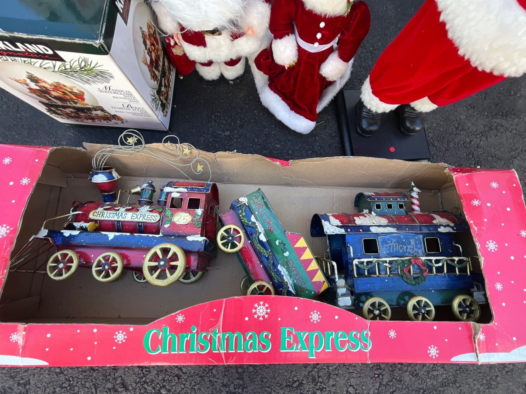 Santa statue 28” and Christmas express train Christmas globe and a small statue set Mrs. Claus and Mr. Claus