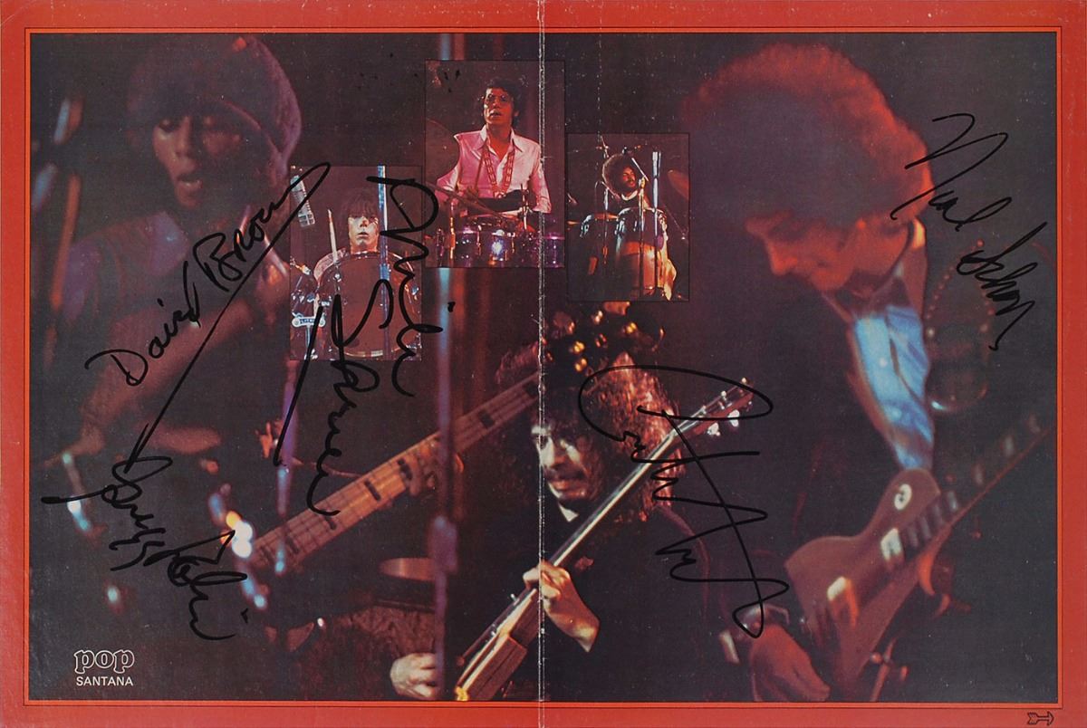Color 16.75 x 11 German magazine photo of Santana and his band members performing, signed in black felt tip by Carlos Santana, Neal Schon, Mike Shrieve, David Brown, and Gregg Rolie. In fine condition, with expected handling wear. Consignor notes that these vintage signatures were obtained in person in Vienna during the early to mid-1970s.