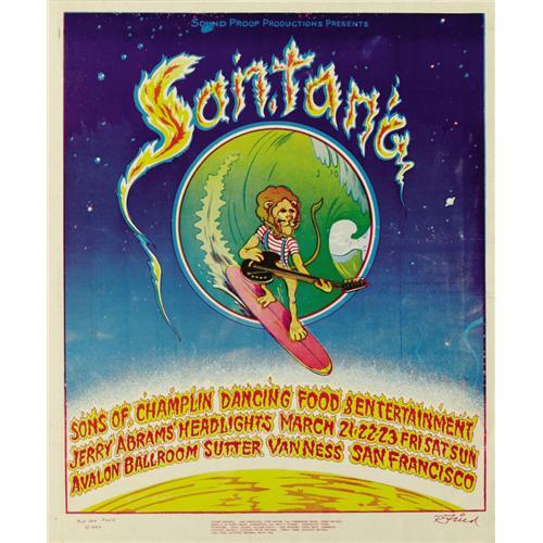 <B>Santana Soundproof Productions Avalon Concert Poster (1969)</B></I> One of the toughest to get posters from the Soundproof Productions shows at the Avalon Ballroom. Fewer than 500 were printed of this poster by Underground Comix publisher Rip Off Press. Other than slight print lines this poster grades NM. Joining Santana at this show were the Sons of Champlin. This poster measures 14" x 17".