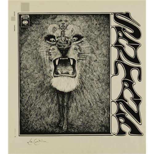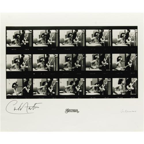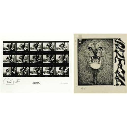 <B>Santana Unused First Album Slick and Photo Sheet (1969).</B></I> Carlos Santana and his namesake band were a popular act in the San Francisco-Bay Area throughout the late 1960s, playing often at venues like the Fillmore. In 1969, they released their classic first album on Columbia; for the cover art, they chose popular poster artist Lee Conklin, who adapted the "Lion's Head" design first used on poster #BG134. The result was spectacular. This lot includes an unused album slick, which has been signed by Conklin. Also included in this lot is a large photo proof sheet, featuring shots of Carlos wailing on his Les Paul, from those first album sessions (that's Dave Brown on bass in the background). The pictures are by well-known Rock photographer Jim Marshall, and he has signed the sheet. Both items are in NM- condition; the slick measures 13.5" x 15", and the photo sheet measures 24" x 20".