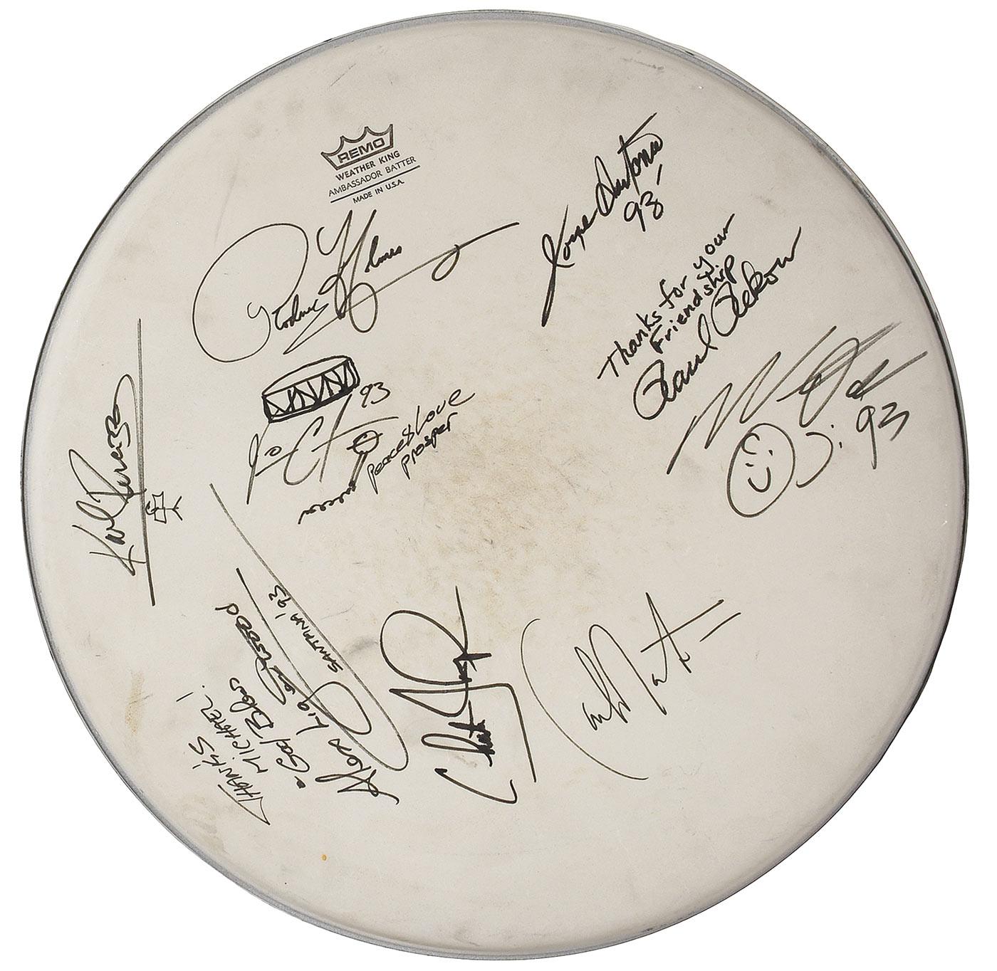 Used Ambassador-coated Remo 16” drumhead, signed in black felt tip by Carlos Santana, Jorge Santana, Rodney Holmes, Chester Thompson, Alex Ligertwood, Karl Perazzo, Raul Rekow, Vorriece Cooper, and Myron Dove. In fine condition, with expected light soiling and dings from use. Consignor notes this drumhead was presented to a New Jersey chiropractor who had several of the band members as clients.