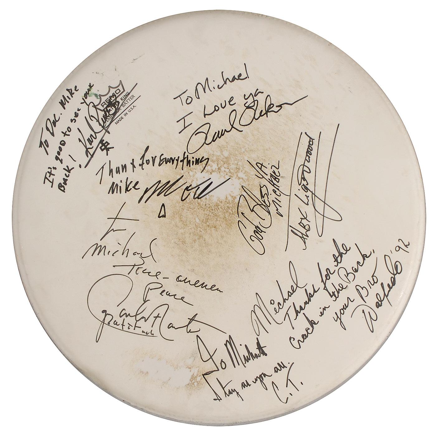 Used Ambassador-coated Remo 14” drumhead, signed in black felt tip by Carlos Santana, Rodney Holmes, C. T. Chester, Alex Ligertwood, Karl Perazzo, Raul Rekow, Walfredo Reyes, and Myron Dove, with all inscribing to Michael. In fine condition, with expected light soiling and dings from use. Consignor notes this drumhead was presented to a New Jersey chiropractor who had several of the band members as clients.