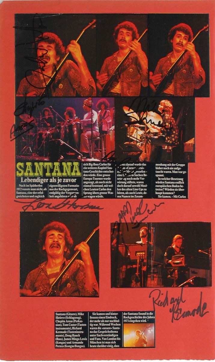 Two items: a color 10 x 12.25 German magazine photo of Santana playing the guitar on stage, signed and inscribed in black felt tip by Santana; and a red 12 x 19.75 scrapbook page bearing affixed magazine photos of Santana and his band, signed in black felt tip by Santana, Jose “Chepito” Areas, Mike Shrieve, Tom Coster, Leon Thomas, Richard Kermode, and Doug Rauch; the reverse side bears several affixed magazine photos of the band Slade, signed in black felt tip by Don Powell (2), Noddy Holder, Jim Lea, and Dave Hill. In overall very good to fine condition, with heavy creasing to the single-signed page. Consignor notes that these vintage signatures were obtained in person in Vienna during the early to mid-1970s.