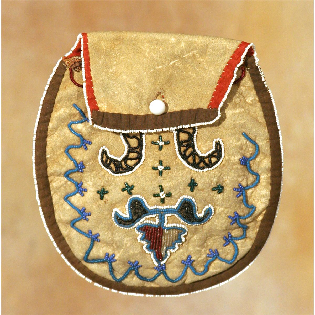 Santee Sioux Bag. 7" x 6.25". Beautiful beaded designs and edgework. Lined with paisley trade cloth. Single button closure. 19th century.