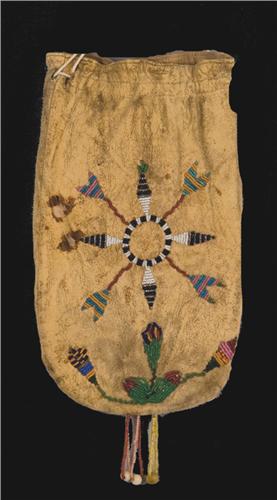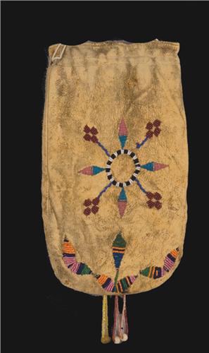 Santee Sioux Beaded Bag. 9 1/2" x 5 1/2". Different designs on each side. 19th century. Beadwork is in fine condition. Bag shows two age holes. (est $600-800)