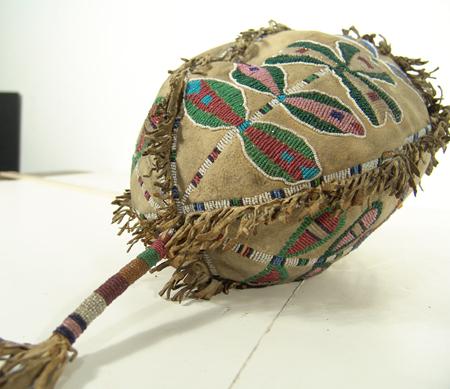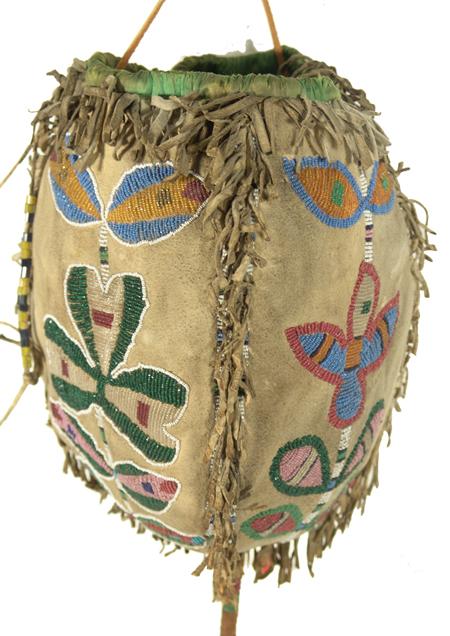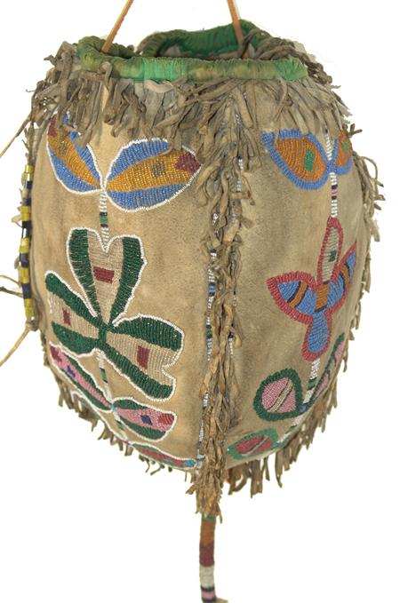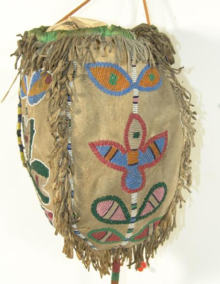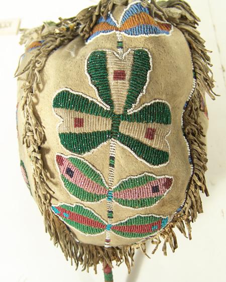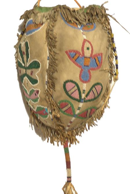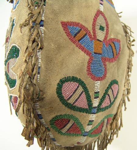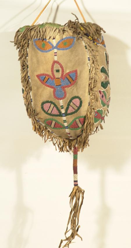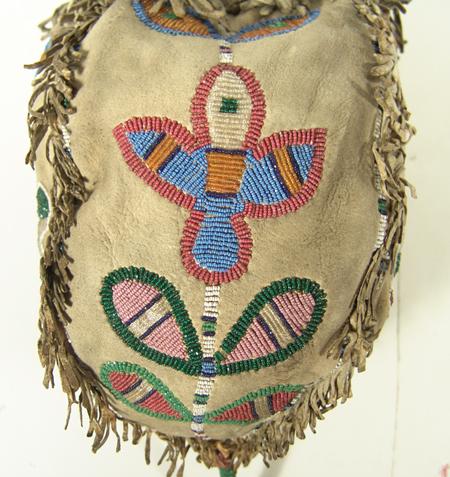 Scarce beaded four-panel medicine bag, each panel with a different floral design and with beaded handle and tail. Purchased from Allard in 1978 for $1,000; appraisal value $2,500. Condition: very good. 8-1/2" x 6"
