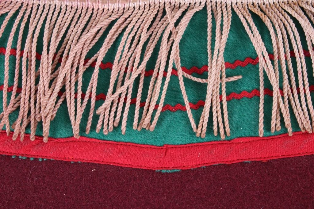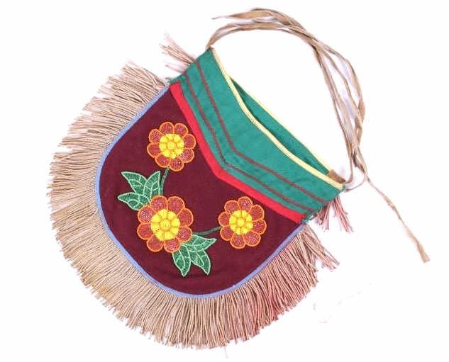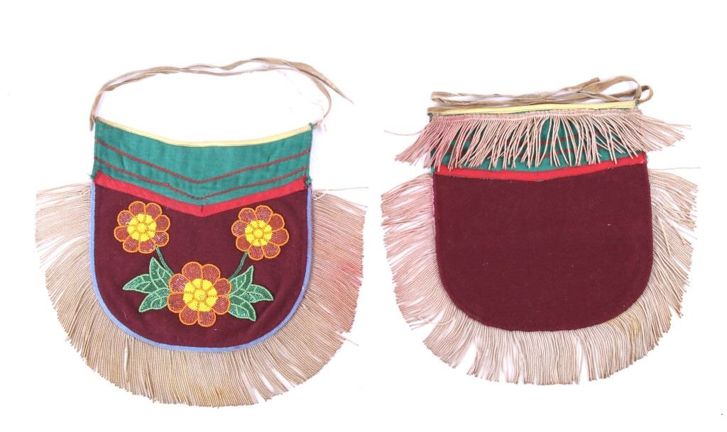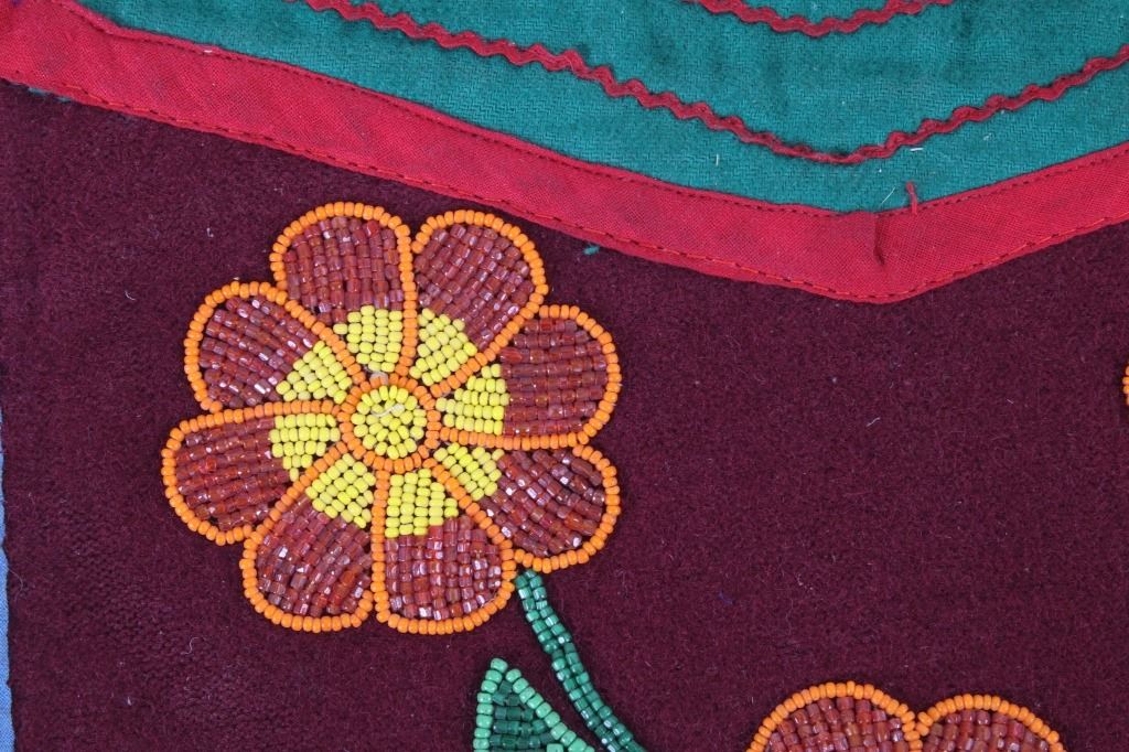The lot features a floral beaded breech clout from the Santee Sioux Native American Indians from the mid-20th Century. The set shows a front and back breechclout used for warrior full dress or ceremonial dress. The set is constructed of trade clothe and trade wool having a green, red and maroon coloring with yellow trim and braided long presentation like fringe. The set shows Indian tanned hide long ties and would have been worn around the users waist. The beadwork shows three flowers of orange, corn yellow and faceted semi-transparent orange with faceted semi-transparent green and medium green leaves and stem. The set shows overall good condition. Each measures 15.5"x13.5" with fringe and 14-15"L ties.