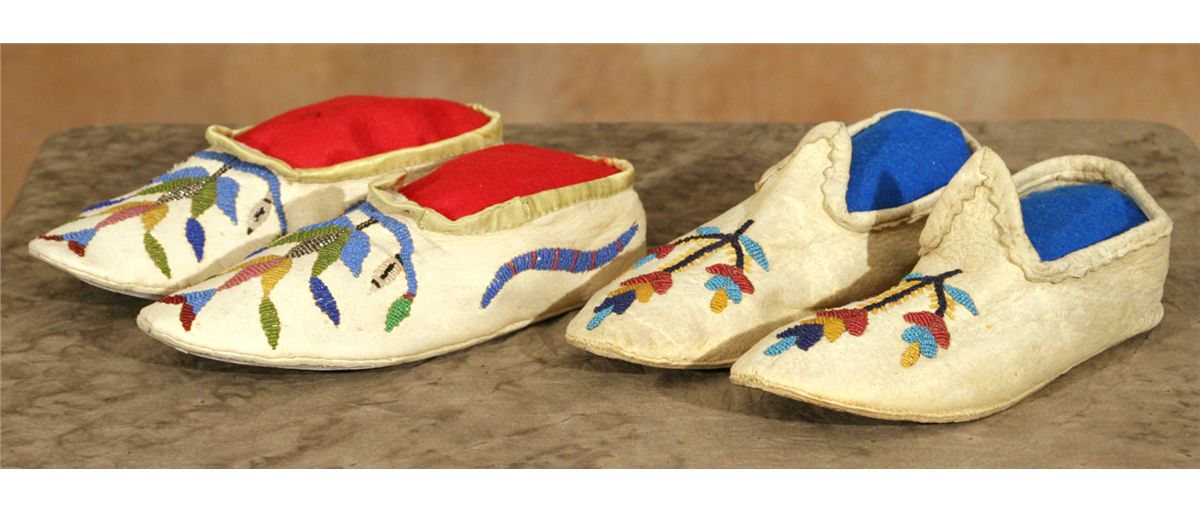 Two pairs of Santee Sioux Slippers. Both 9.5" long. Fine floral beadwork in a multitude of colors on Indian tanned hide. One exhibits a scalloped edge, the other has silk edging. Circa 1910 and 1890.