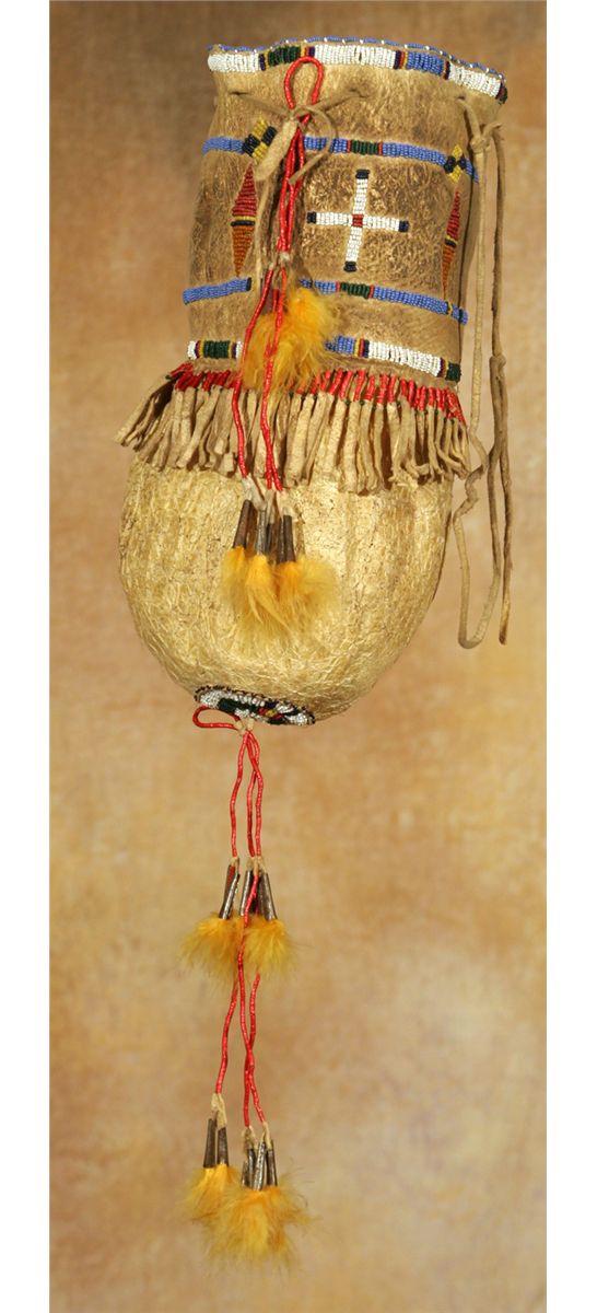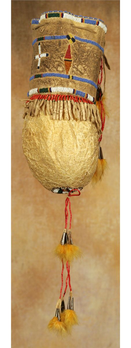 Santee Sioux Bladder Bag. 12" long, 5" in diameter. Exceptional old bag with beautiful beadwork, quillwork, fringe and tassels. The original leather ties at the top and a beaded roundel on the bottom are adorned with quilled tassels terminating in tin cones filled with chicken feathers. The top 6" of the bag is beaded tanned hide with quilled fringe. The bottom half of the bag is the actual buffalo bladder. 19th century. Provenance: Ex-Wintersteen collection.