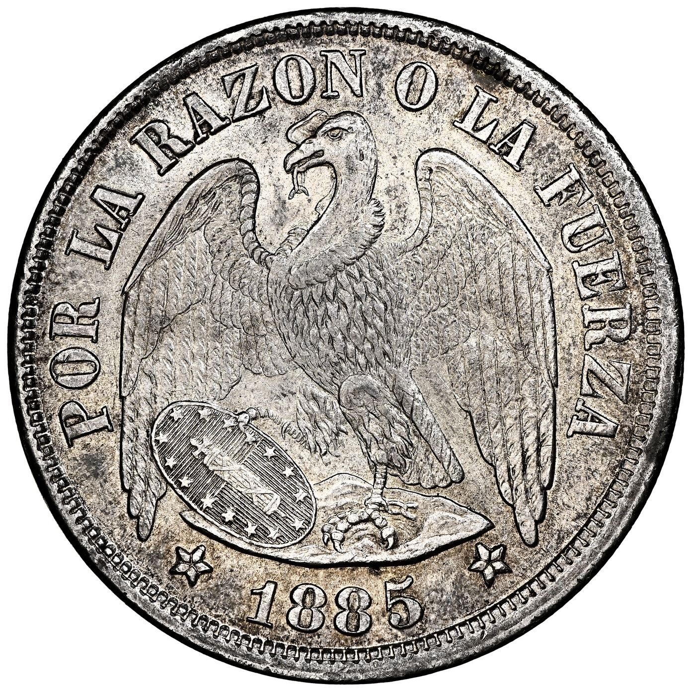 Santiago, Chile, 1 peso, 1885/4, NGC MS 64, finest known in NGC census.
