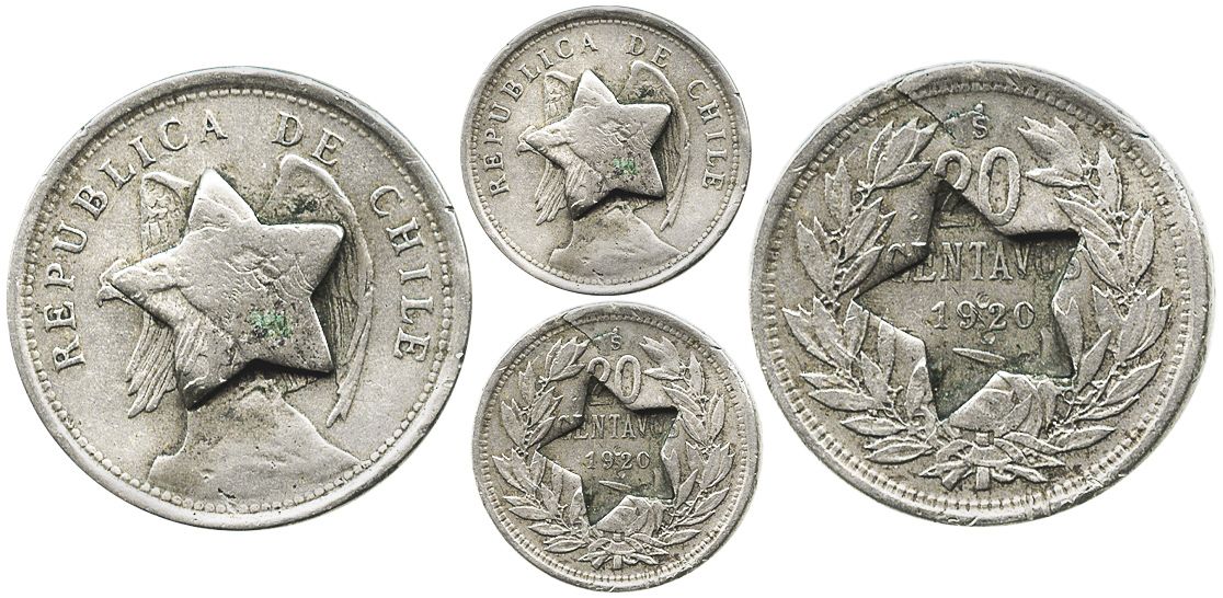 Santiago, Chile, 20 centavos, 1920, with unidentified star countermark in center. KM-167.1. 4.5 grams. Lightly toned VF with very deeply impressed countermark on denomination side (protruding from the other side) that appears to be the symbolic star of Chile but comes from an unknown issuer.