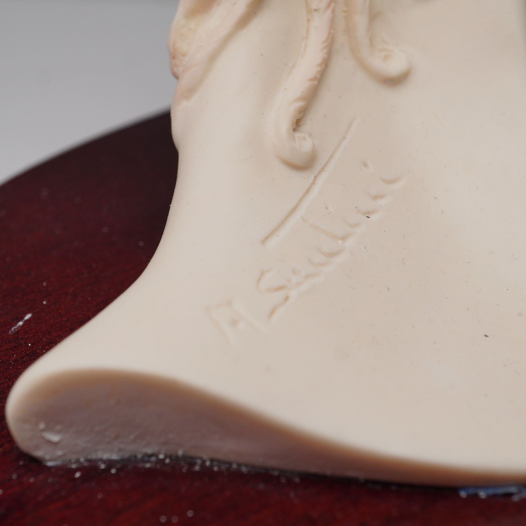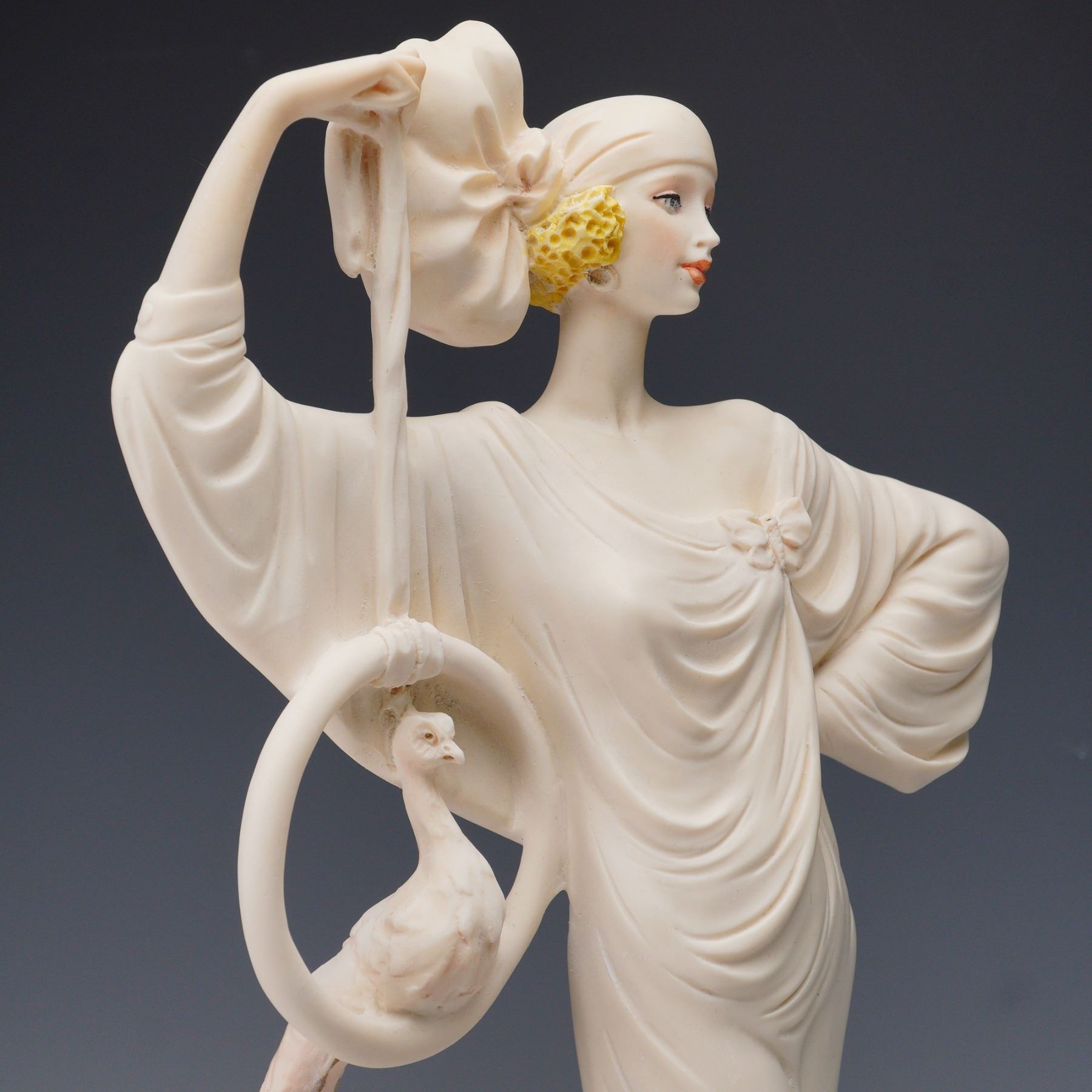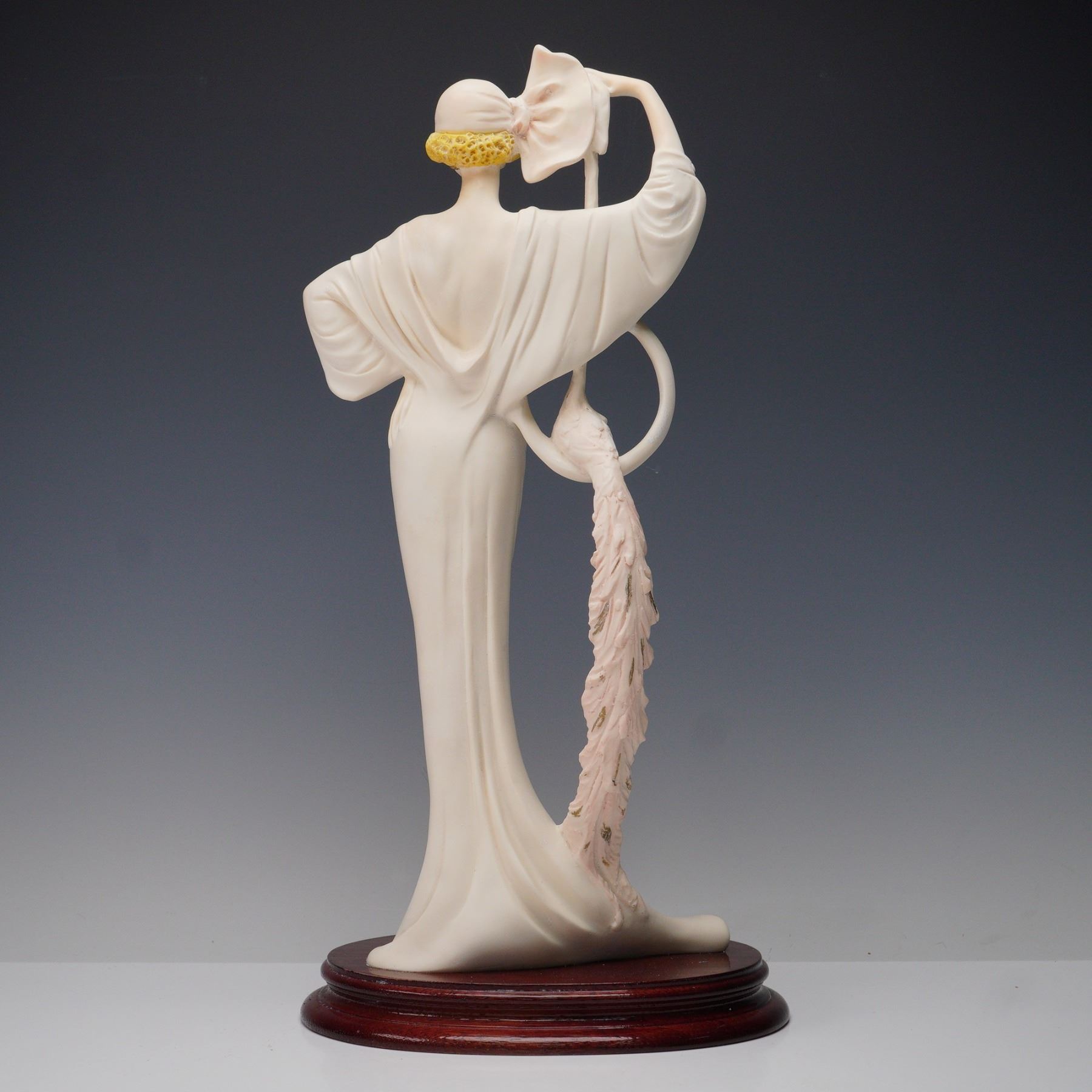 A finely detailed Santini figurine depicting an elegant lady in a flowing draped gown, posed with one hand on her hip and the other holding a circular ring from which a long peacock feather cascades. Executed in ivory-toned composite with delicate features and mounted on a polished wooden base. Signed A. Santini to the side of the base.